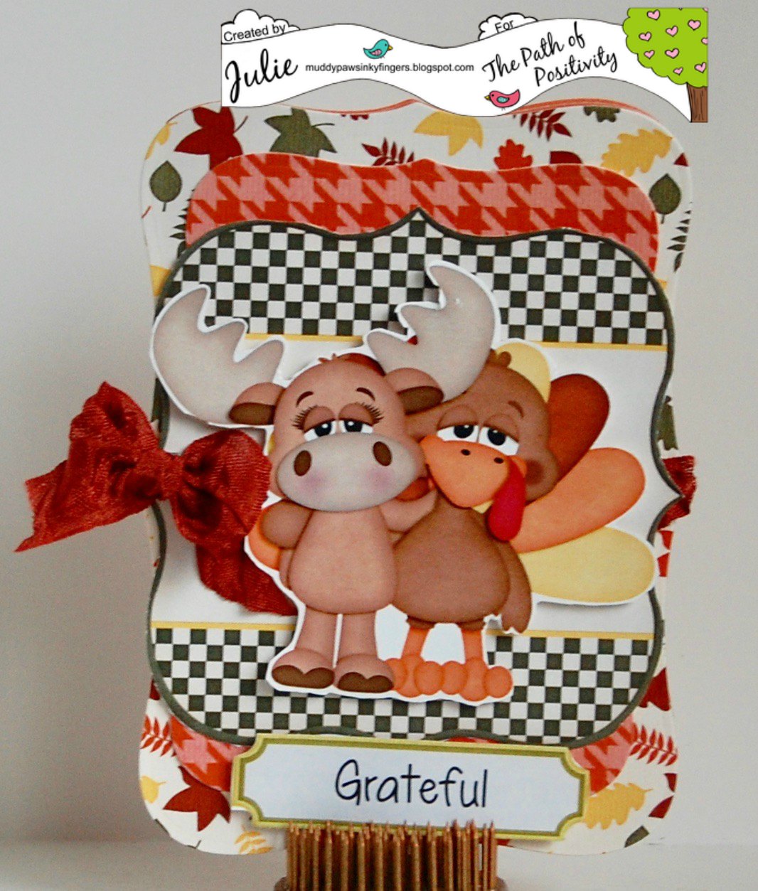 I used several elements from the 'Family Feast Kit' to create this card. The moose and turkey clip are, the 'Grateful' sentiment tag, the tag behind the twosome, and the awesome papers are all from the Kitten Scraps Family Feast Kit (and there's LOTS more to explore!)