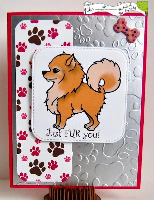 I used an embossing folder and silver paper to create the background, then a pre-printed image from the Life is Better set for the focal point.  The sentiment is part of an acrylic stamp set from stampendous.  The paw print paper is from AMBillustrations, and is digital.  The bone brad is another metallic element on my card.