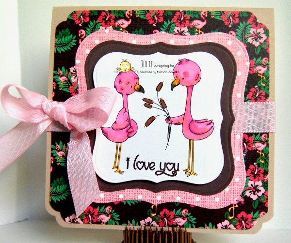 I found a lot of digital flamingo paper, but finding some with brown in it to match those cattails proved a challenge. I found this at Imagine That! Digistamp. It's from the Tropical Breeze digital paper collection. The pink ribbon is from Really Reasonable Ribbon.