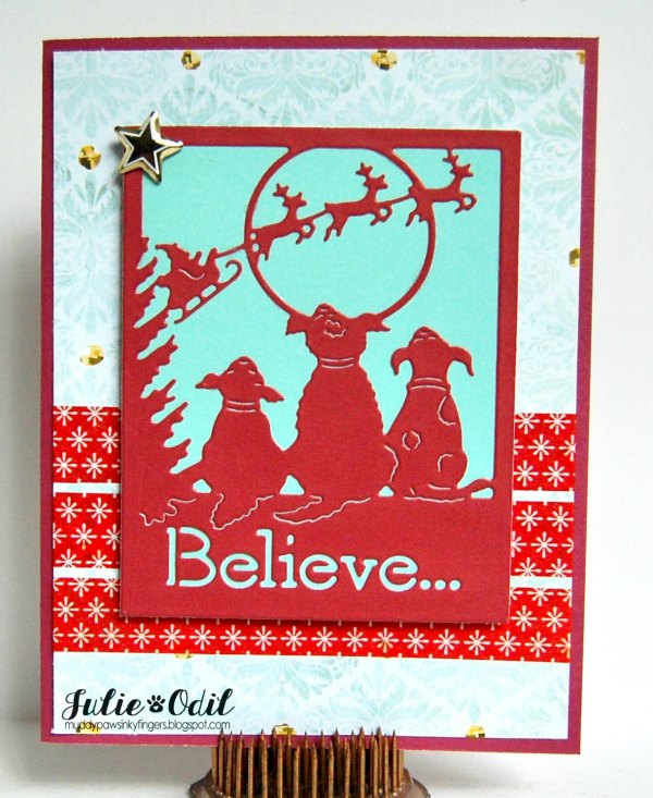 The "Believe" die is from Cottage Cutz, and I think it is perfect for my dog loving friends. I may have to create more like this before the season hits! I used washi tape to make the horizontal accents, and the star brad is from Hot Off the Press.