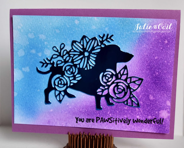 One of my favorite things to do is to ink up a bunch of backgrounds, lightly mist them with water so the ink can react to the water, then when they dry, cut out some dies. That's what I did with all these cards. This first card, above, uses a die from Tonic Studios.