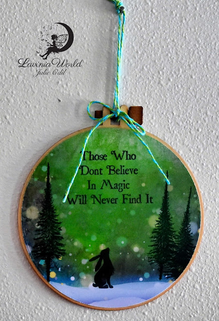 I used a paper from the Lavinia World Store. It is called Winter Chill. The cute bunny that is watching the diamonds of snow descend is Pippin (miniature). The trees are the Small Fairy Fir Tree. They have a long stem on them, so I taped off a portion of the stem before I stamped, them removed the tape before stamping. They were stamped with VersaFine Clair Ink in Rain Forest. The sentiment is Believe in Magic. Both the sentiment and Pippin were stamped with Tuxedo Black Memento Ink.