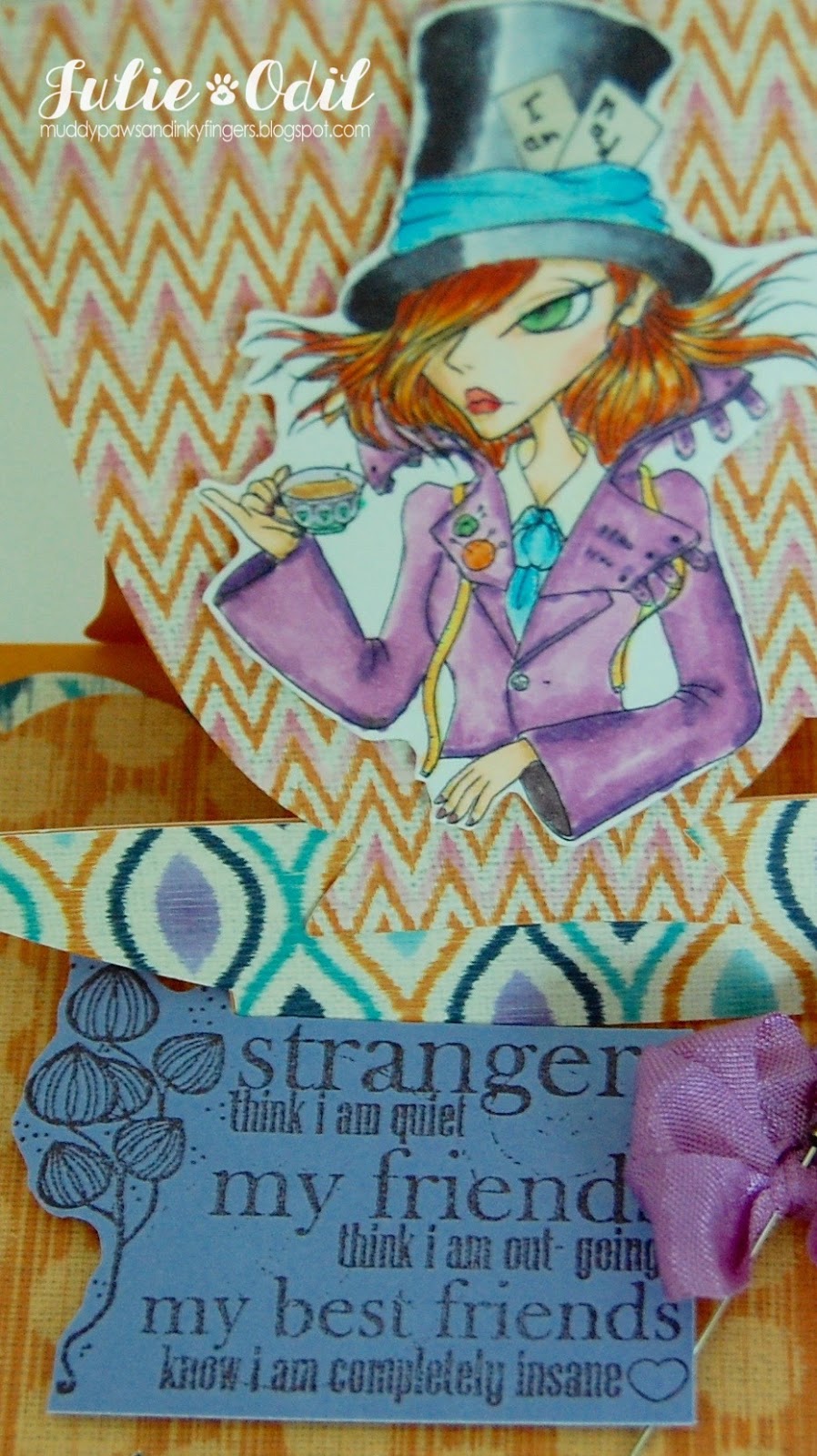This image is from The East Wind. The image is Lucy Loo 'Mad Hatter'. I colored her with Copic markers and fussy cut her. Here's a close up of the image and the sentiment. The sentiment is from Unity Stamp Company. It seemed very appropriate for The Mad Hatter!