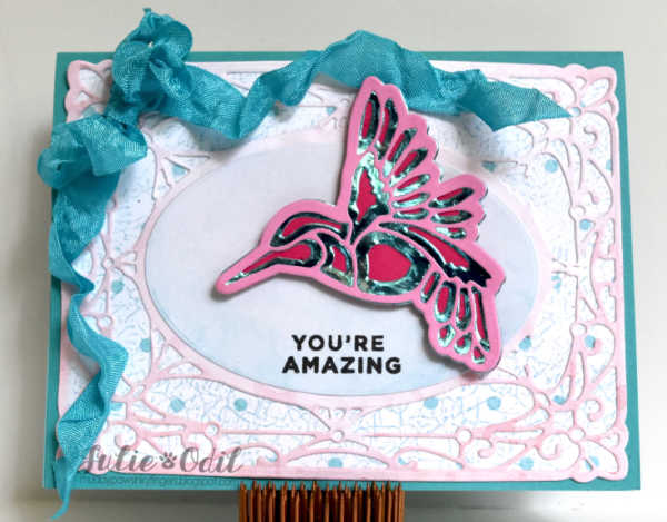 The patterned papers on this card are from We Are 3 Digital Shop. The metallic paper used with the hummingbird was purchased from Crafters Companion. The sentiment is an acrylic stamp from Close To My Heart, and the crinkle ribbon is from D.L. Art.