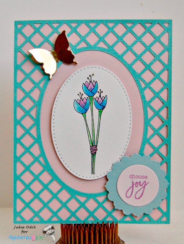 The card base was cut out on my Silhouette Cameo 3, with a lattice cutting file found at My Scrap Chick. The sentiment is a stamp from Close To My Heart, cut out with dies from Paper Wishes, as is the butterfly die.